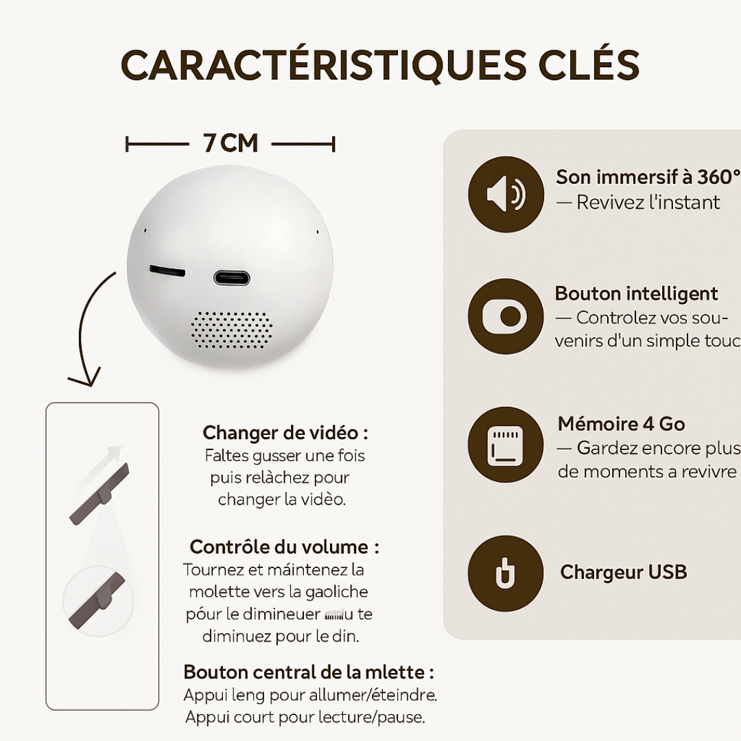 Une expérience simple, élégante et émotionnelle. Vos souvenirs, un son 360°, et un design unique qui illumine chaque instant.